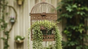 Vintage birdcages make excellent hanging planters. Place trailing plants or flowering pots inside to create a romantic, airy display. Hang them from tree branches or pergolas.