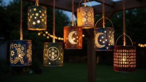 Punch decorative holes in empty paint cans and add bulbs inside. Hang them as outdoor lanterns for patterned, rustic lighting in patios or walkways.