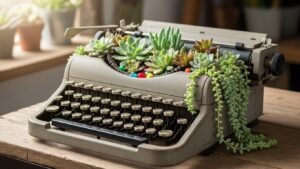 Turn vintage typewriters into novelty planters by filling the inner sections with succulents or small flowers. It creates a quirky, conversation-starting garden accent.