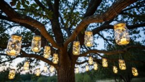 Repurpose glass jars into lanterns using tealights or solar lids. Hang them on hooks, fences, or tree branches for soft, ambient lighting in the garden.