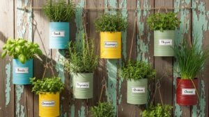 Collect empty tin cans, paint or decorate them, and use them for a hanging herb garden. Drill drainage holes to keep herbs healthy and vibrant.