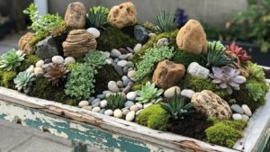 Remove the top of an old table and fill the frame with rocks, moss, succulents, or tiny plants. This creates a raised garden bed or a textured decorative feature.