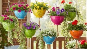 Old colanders are perfect hanging planters. Their drainage holes prevent waterlogging. Paint them bright colors for a cheerful, functional garden display.
