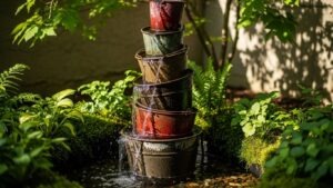 Stack a series of old buckets so water flows from top to bottom, creating a rustic mini-waterfall. Add aquatic plants or stones for an eye-catching backyard feature.