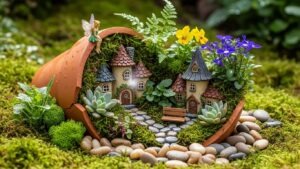 Use shattered terracotta or ceramic pots to create layered fairy gardens. Add moss, pebbles, miniature furniture, and tiny figurines to craft a whimsical, magical scene.