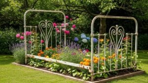 Metal bed frames can outline garden beds, serving as unique borders. Their intricate designs add a whimsical charm, and they can support climbing plants like roses or clematis.