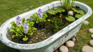 Retire an old clawfoot tub by converting it into a small water garden. Add aquatic plants, stones, and even tiny fish for a unique backyard feature.