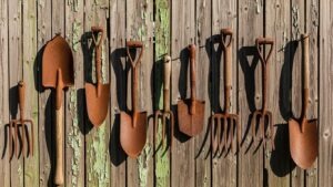 Repurpose old gardening tools as a decorative wall feature. Hang shovels, rakes, and trowels on a fence or shed wall for a rustic, functional display that doubles as art.