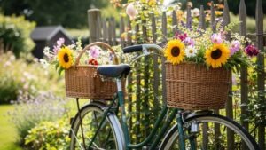 Old bicycles with baskets can serve as romantic, nostalgic planters. Add colorful flowers in the baskets, and lean the bike against a fence or wall to create a charming focal point.