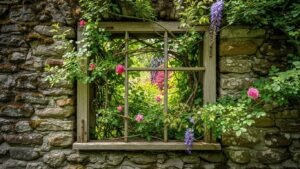 Old windows can become artistic garden décor. Hang them on a wall as a frame for climbing vines or attach mirrors for reflective interest. They also create a vintage vibe.