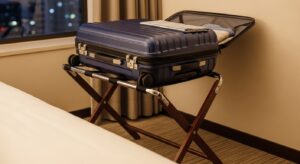 A foldable luggage rack keeps guests’ suitcases off the floor and adds a touch of hotel-style convenience.