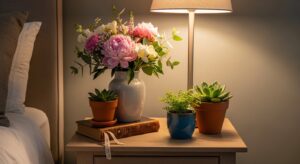 Plants bring life and freshness into any room. A small potted plant, fern, or vase of fresh flowers can instantly brighten the space.