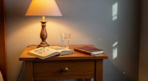 A small nightstand with a lamp, water glass, and charging station helps guests feel cared for and organized during their stay.