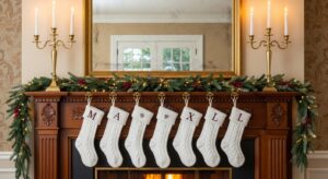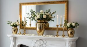 Decorate your mantel with gold candlesticks, white stockings, and a soft garland of greenery. Add a gold mirror or metallic wall art above for an elegant focal point.