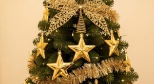 Choose ornaments shaped like stars, snowflakes, or hearts in shimmering gold tones. For the finishing touch, top your tree with a white or gold star for that picture-perfect look.