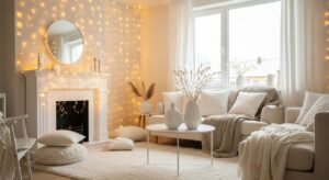 Warm lighting enhances the white and gold color palette. Use fairy lights, LED candles, or string lights in soft yellow tones to make your space glow like a cozy holiday dream.