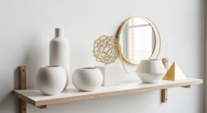 Keep shelves light and elegant with white ceramics, gold figurines, and candles. Less is more with this color palette — aim for a clean and polished display.