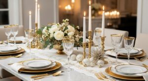 For your dining area, use a white linen tablecloth as your base and layer it with gold chargers, white dinnerware, and crystal glassware. Add gold flatware and small white candles to complete a truly sophisticated table setup.