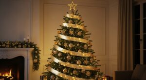 Wrap soft gold or champagne-colored ribbon around your tree in loose spirals or bows. The ribbon helps create flow and elegance, tying all the elements together.