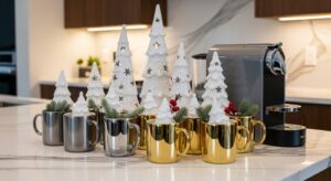 Even your kitchen can get festive! Add gold-rimmed mugs, white tea towels with gold embroidery, or a small tabletop tree with metallic ornaments for a touch of sparkle.