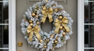 Hang a wreath with white berries, gold ribbon, and frosted pinecones on your door or over your fireplace. It’s a simple way to set the tone for your entire home.