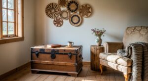 Flea market finds like antique mirrors or wooden chests.