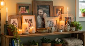 Framed family photos in rustic frames.