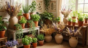 Potted herbs like rosemary or lavender in clay pots.