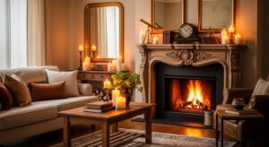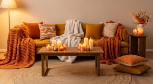 Every room needs a cozy focal area, and in fall, that’s often the living room or fireplace. Arrange seating around a fireplace, add a soft area rug, and style your mantel with autumn garlands, candles, and rustic décor. If you don’t have a fireplace, you can create a similar effect with a decorative candle display or a cozy reading nook filled with blankets and cushions.