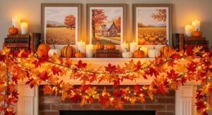 Decorate with layered garlands made of leaves, acorns, or wheat stalks. Add candles, framed autumn prints, and stacked books with cozy tones.