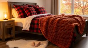 Think chunky knit throws, plaid blankets, and velvet or faux fur pillows.