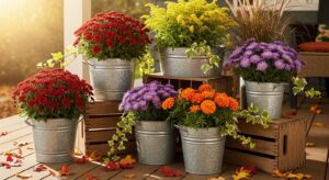 Mixing materials and tones gives your porch personality. Combine wood, metal, and fabric elements for a balanced look. Think of a galvanized bucket filled with chrysanthemums beside a wooden bench draped in plaid. The contrast creates visual interest that draws attention without feeling cluttered.