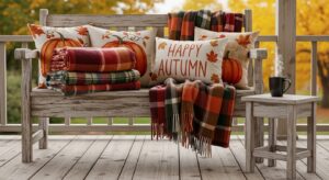 Bring warmth and comfort outdoors with blankets and throw pillows in fall colors like burnt orange, mustard, and deep red. If you have seating on your porch, drape a plaid blanket over a chair or bench. This not only makes your porch inviting but also ties in the cozy feel that defines autumn.