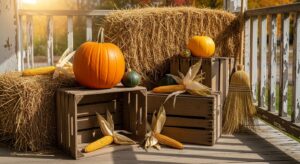 Nothing says fall like the beauty of nature. Incorporate hay bales, corn stalks, and baskets of seasonal produce such as pumpkins, apples, and gourds. Combine them with rustic wooden crates or wicker baskets to create depth and a layered look. These organic touches set a charming foundation for your fall front porch decor.