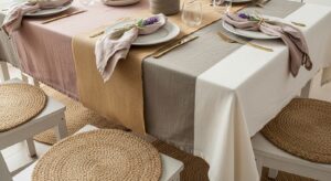 Tablecloths: Linen or cotton in earthy neutrals (cream, taupe, olive) creates a versatile canvas.