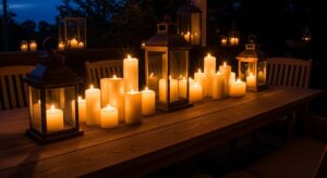 Clusters of Candles: Mix tall taper candles with short tea lights for depth.