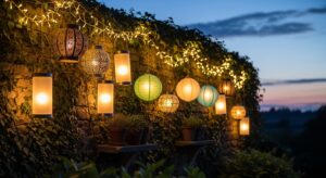 Illuminate your garden walls with hanging lanterns or fairy lights. The soft, twinkling glow creates a magical, dreamy ambiance for evening relaxation.