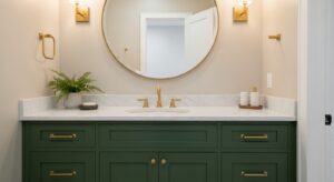 Upgrade your vanity with a fresh coat of green paint or install new cabinetry in muted olive or deep moss tones. These rich colors pair beautifully with gold, black, or brushed nickel hardware for a sophisticated touch.