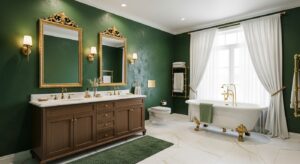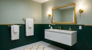 For a luxurious touch, mix green décor with metallic finishes. Brass mirrors, gold faucets, or copper accents contrast beautifully with both light and dark greens, creating a balanced, elegant look.