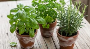 Herbs: Basil, parsley, mint, and rosemary.