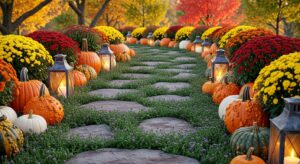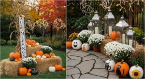 A garden pathway can become a seasonal showcase. Line it with pumpkins, mums, or lanterns to guide guests through your garden. Add stepping stones or mosaic tiles for extra charm.