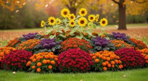 Fall gardens benefit from thoughtful structure. Plant tall grasses or sunflowers in the back, mid-height mums or asters in the middle, and groundcovers like violas or creeping thyme in front.