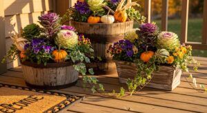 Container gardens allow flexibility and creativity. Fill pots with ornamental kale, violas, or pansies. Add seasonal touches like mini pumpkins or trailing ivy.