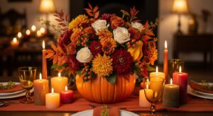 Pair pumpkin floral arrangements with candles in matching autumn colors to create warm, cozy displays for evening gatherings. -
