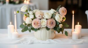 A white pumpkin paired with ivory roses, eucalyptus, and blush dahlias for a soft, romantic aesthetic perfect for weddings or minimalist homes. -