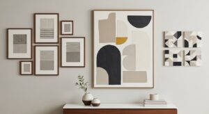 Try canvas paintings, photo collages, or minimalist abstract art created with paint and tape.