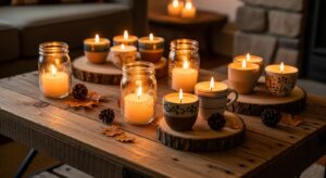 Candles create a cozy, warm vibe. Try DIY soy candles with essential oils or craft rustic candle holders using mason jars, wood slices, or concrete molds.