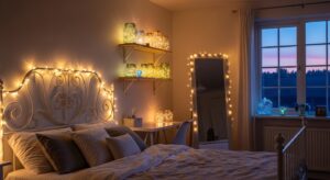 Wrap fairy lights around a mirror, drape them over a headboard, or place them in glass jars to create an ambient glow.