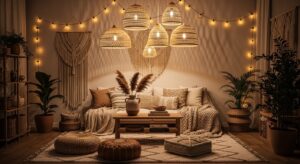 Lighting plays a huge role in setting your home’s mood. Instead of sticking with generic fixtures, make your own. Use woven baskets for a natural pendant light, string up fairy lights around mirrors, or craft your own lampshade using rattan or linen. A DIY lighting setup brings a warm, inviting atmosphere and elevates your home aesthetic DIY look with a custom touch.