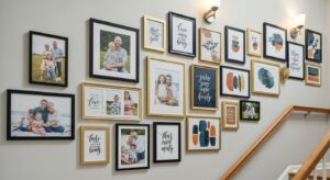 Stick to a color palette—like black-and-white photos with gold frames, or colorful art in simple wooden frames—to keep the look cohesive.